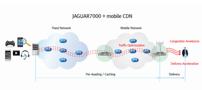 JAGUAR7000 is world’s first LTE edge cache that can be deployed at eNB in close proximity to subscribers. Increase of mobile traffic have mobile ISP to face with several challenges such as service degradation by burst traffic, poor QoE by transmission delay, more infrastructure expansion and higher operation cost. Mobile operators today are facing challenges to overcome, such as service degradation from surge of mobile traffic in burst, poor QoE by transmission delay, and increased cost for network expansion and operation. With traffic optimization technology specially designed for LTE network, JAGUAR7000 reduces traffic more than 30% in LTE network to resolve congestion over LTE core/backhaul and saves huge costs for infrastructure expansion and operation. Also, it maximizes QoE by delivering contents directly from edge cache system located at eNB location close to subscribers during traffic congestion.
