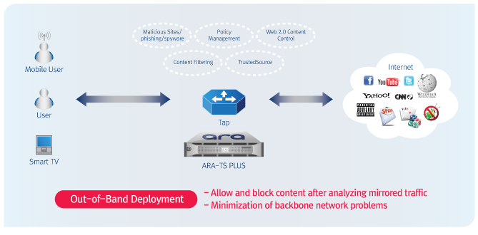 ARA-TS Plus can manage and take control of harmful web contents such as pornography, gambling, offensive articles against government and corporate by updating and applying the network security policy and guidelines of government, ISP and companies. ARA-TS Plus offers flexible filtering scheme by integrating with 3rd party filtering DB such as McAfee Smartfilter™ which provides 90 categories and 25 million URLs. The filtering DB provides user-defined category based on log analysis and statistics. Also, the keyword search allows easy finding of the target subject using blocking list.